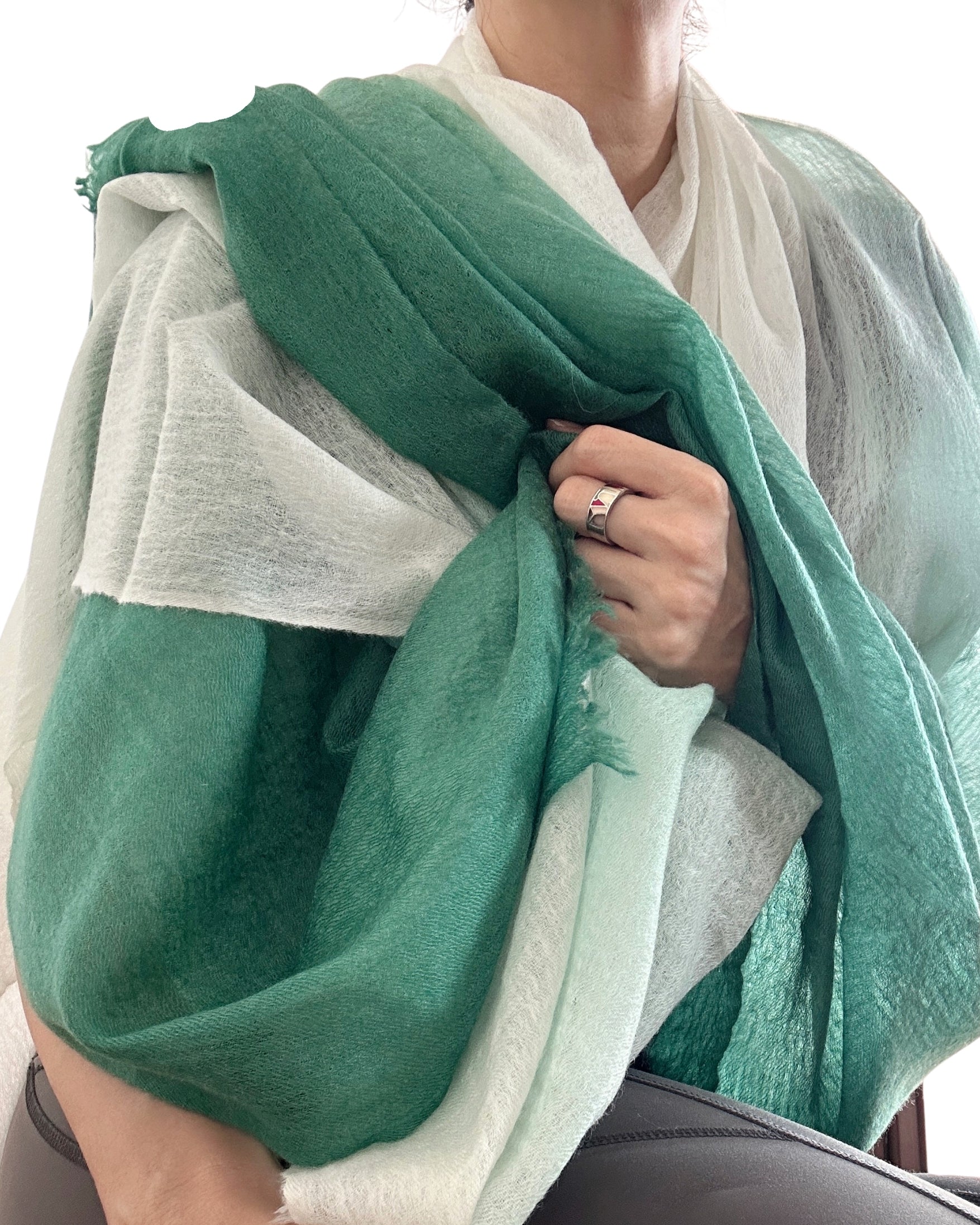 Inspired by the serene beauty of evergreen landscapes, this Juniper dégradé stole is a masterpiece of artisanal craftsmanship. This handwoven stole features a delicate gradient of green tones that evoke nature's quiet elegance. A specialized finishing process gives it a cloud-like texture, making it feather-light yet luxuriously warm.